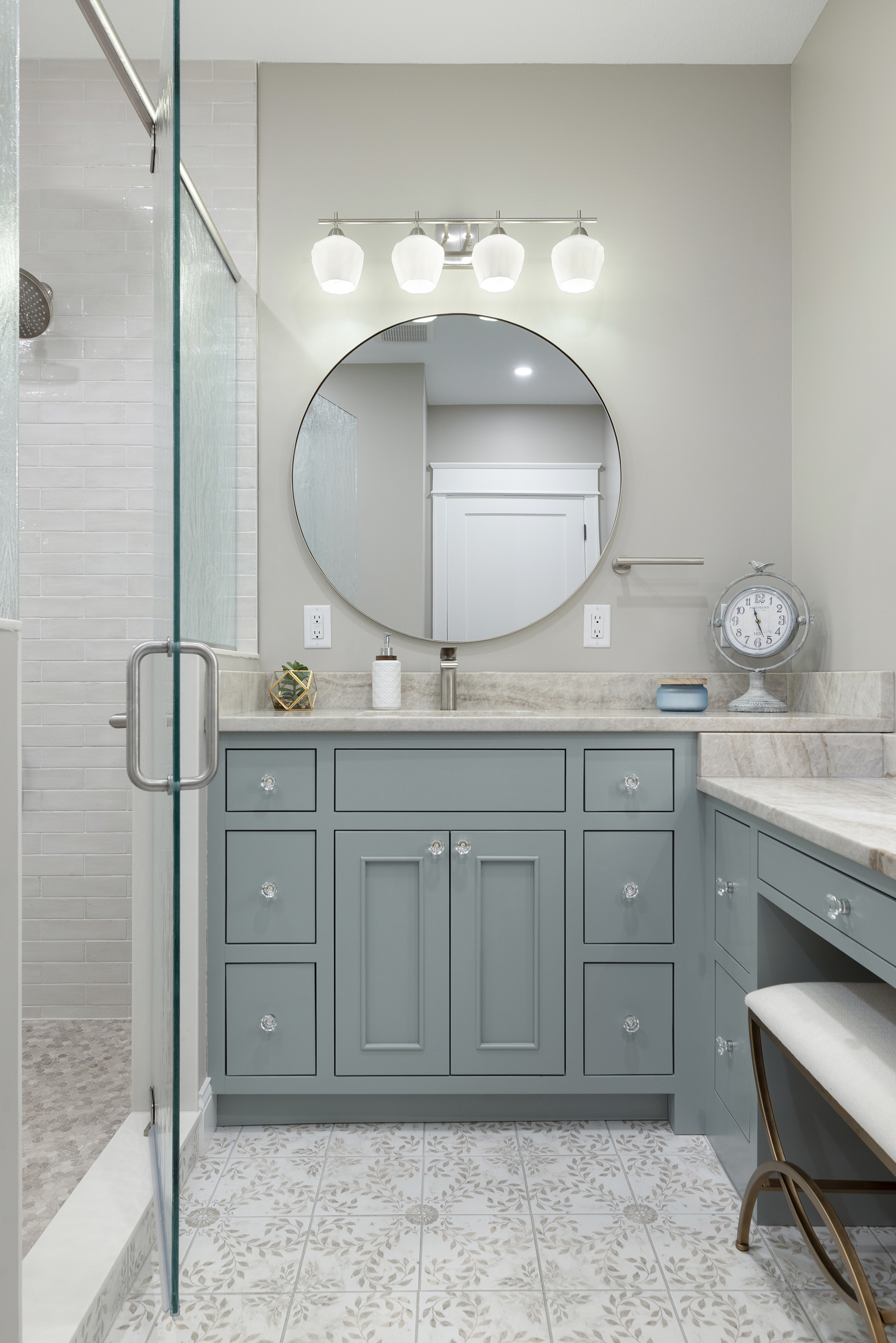 To preserve usable space, the door from the bed to the bath was recessed into an alcove. Custom inset cabinetry is paired with leathered Taj Mahal quartzite countertops for a subtle, elevated finish. The lowered sit-down makeup vanity was carefully designed to maximize drawer access while maintaining ample storage and is complemented by a lighted mirror for usability and ambiance. Given the bath’s central location on the main level, we added sound insulation to enhanced privacy.
