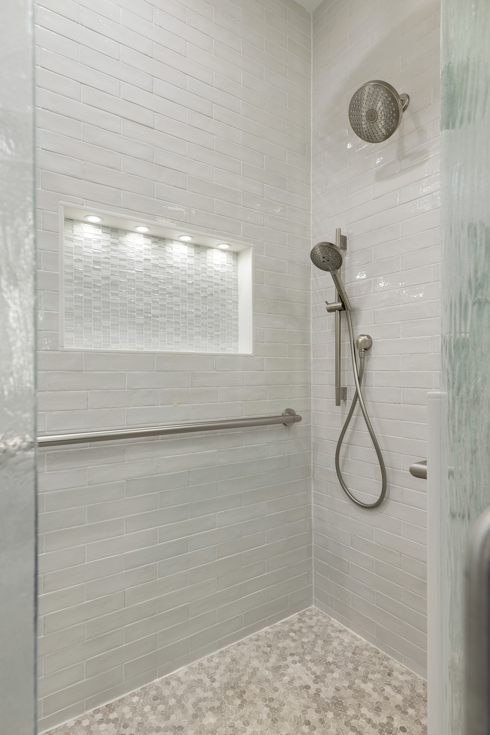 To create this guest suite, we repurposed the former office into a spacious bedroom and converted an underutilized second master closet into an adjoining 60 square foot bathroom. Despite its compact size, the bath includes a 3 by 4-1/2-foot walk-in tile shower featuring two half walls and textured glass to maintain an open feel while providing modesty. A built-in tiled foot niche was incorporated in place of a permanent bench to optimize space, and a lighted niche offers convenient shower storage. Hansgrohe brushed nickel fixtures, including a ceiling mounted rain head, handheld, and standard shower head, enhance comfort, with the faucet valve placed near the entrance for easy access.
