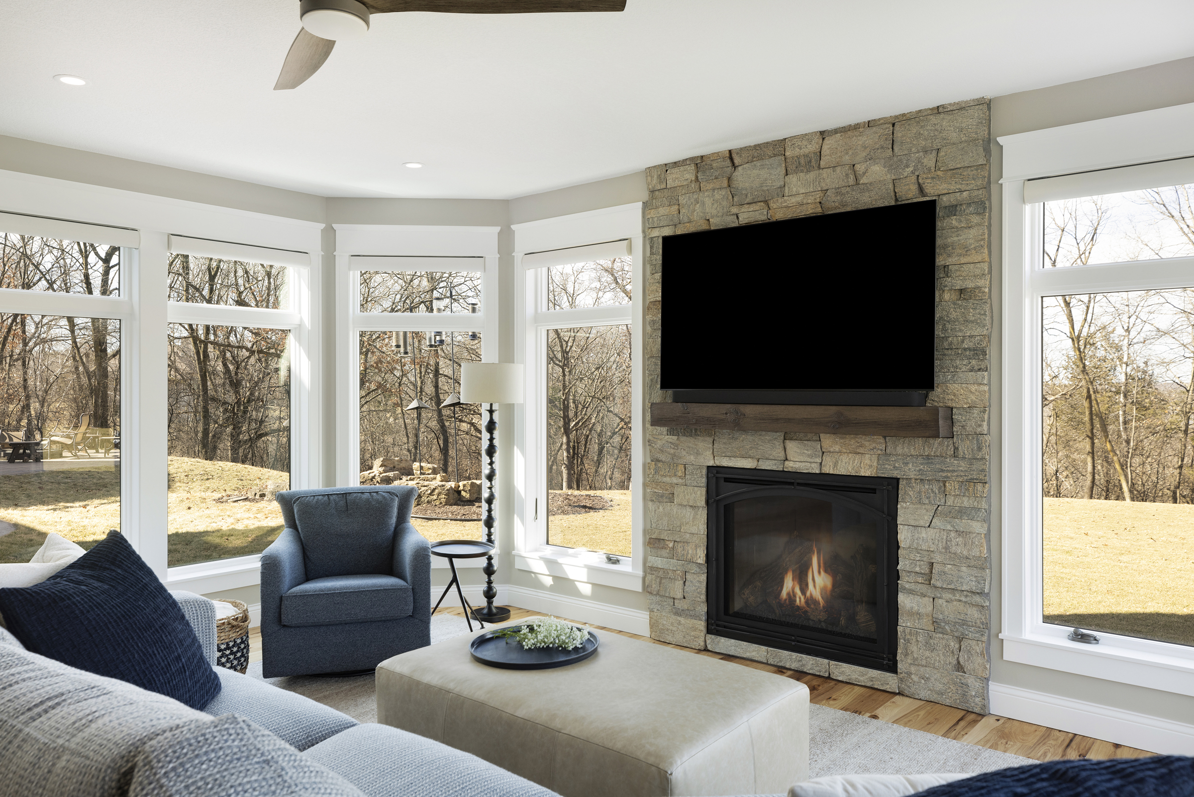 On the main level, the addition extends directly off the primary bedroom, creating a serene sitting room filled with natural light from expansive windows that showcase the view of the wooded bluff. A natural stone surround fireplace with a wood look concrete mantel anchors the space and is paired with a warm barnwood ceiling to add texture and warmth. The transitional-style kitchenette, complete with a beverage fridge, built in under-counter microwave, and dishwasher drawer, allows the clients to enjoy quiet mornings or evenings without leaving the suite. Taj Mahal leathered quartzite countertops and a herringbone tile backsplash add layers of comfort and sophistication.
