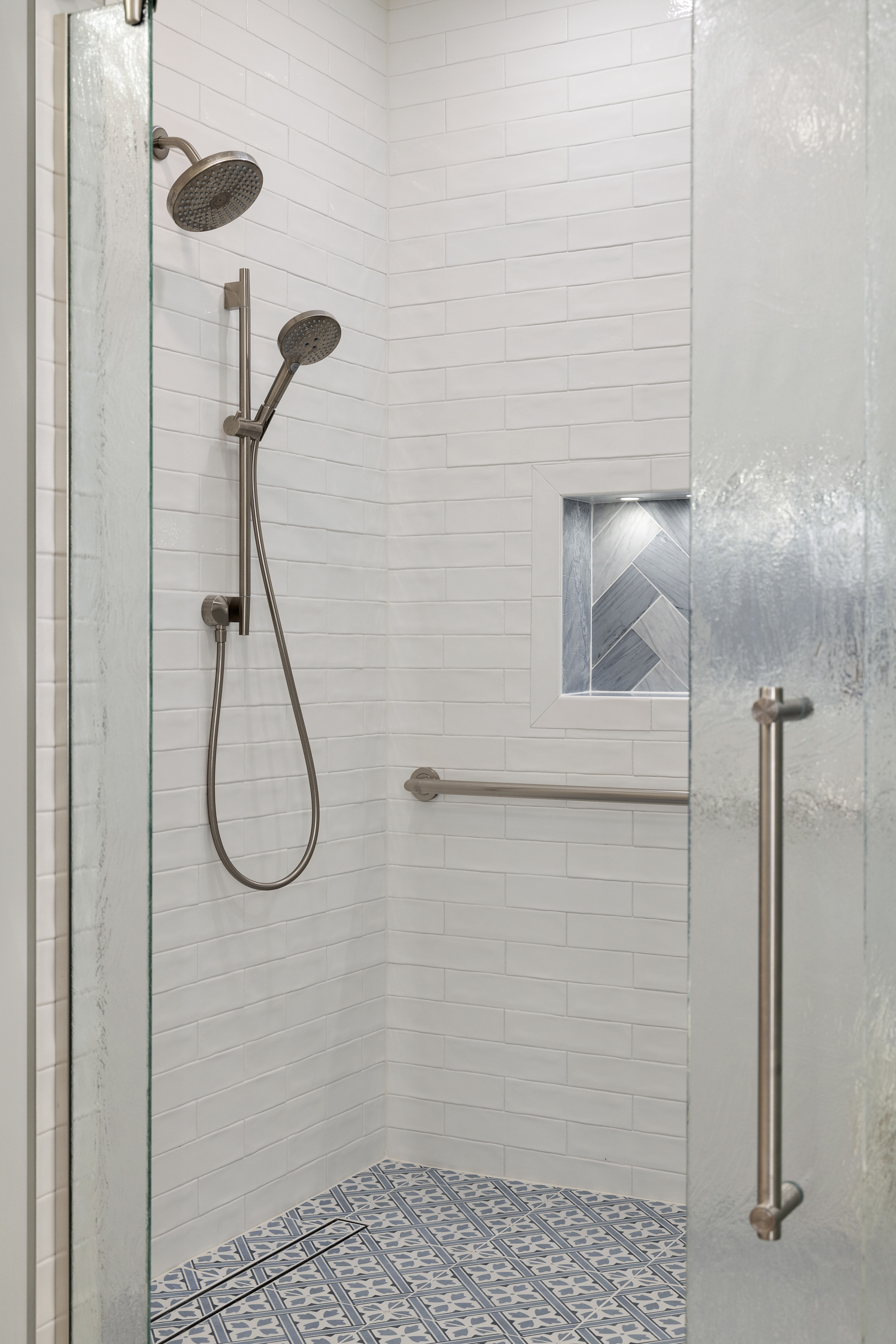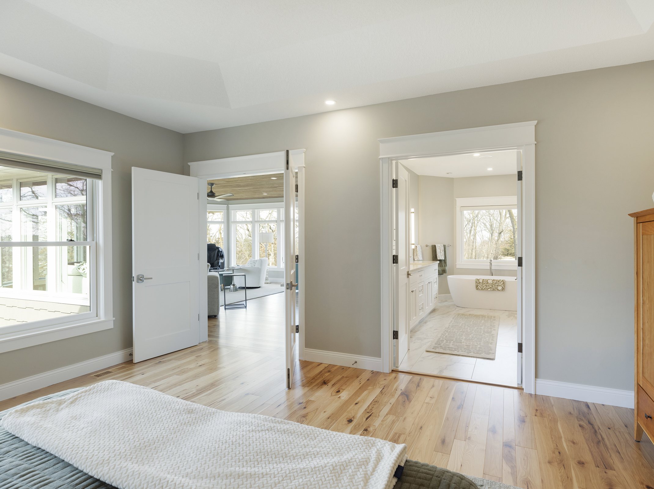 Throughout both levels, hickory flooring, custom inset cabinetry, leathered countertops, white craftsman style trim, and barnwood accents bring warmth and texture, achieving the modern rustic aesthetic Randy and Sheri envisioned. Motorized blinds and heated floors were added to each room to enhance comfort and everyday ease. This addition meets the need for multi-guest hosting, while also delivering a peaceful space for daily living.
